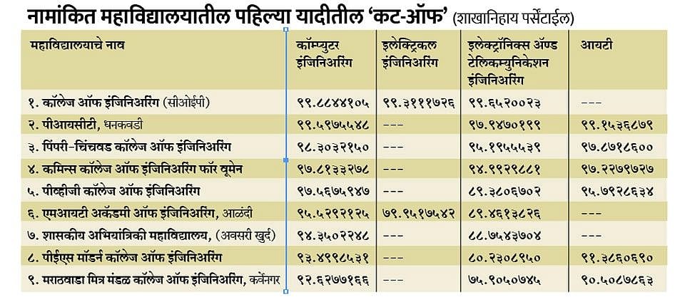 राज्य सामाईक प्रवेश परीक्षा कक्षामार्फत (सीईटी सेल) अभियांत्रिकी पदवी अभ्यासक्रमाच्या प्रथम वर्ष प्रवेशाची पहिली फेरी जाहीर झाली आहे. या फेरीतील कट-ऑफ देखील सीईटी सेलने जाहीर केला आहे. पहिल्या फेरीत नामांकित महाविद्यालयातील कॉम्प्युटर इंजिनिअरिंग, इन्फॉर्मेशन टेक्नॉलॉजी (आयटी), आर्टिफिशल इंटेलिजन्स ॲण्ड मशिन लर्निंग, आर्टिफिशल इंटेलिजन्स ॲण्ड डेटा सायन्स शाखांचा कट-ऑफ ९९ ते ९० पर्सेंटाईल असा सर्वाधिक असल्याचे दिसून येते. तर, सिव्हिल इंजिनिअरिंग, इलेक्ट्रॉनिक्स ॲण्ड टेलिकम्युनिकेशन इंजिनिअरिंग (ई ॲण्ड टीसी), मेकॅनिकल इंजिनिअरिंग, इलेक्ट्रिकल इंजिनिअरिंग अशा शाखांमध्ये तुलनेने कमी पर्सेंटाईल असले, तरीही प्रवेशाचा मार्ग मोकळा होण्याची चिन्हे आहेत.