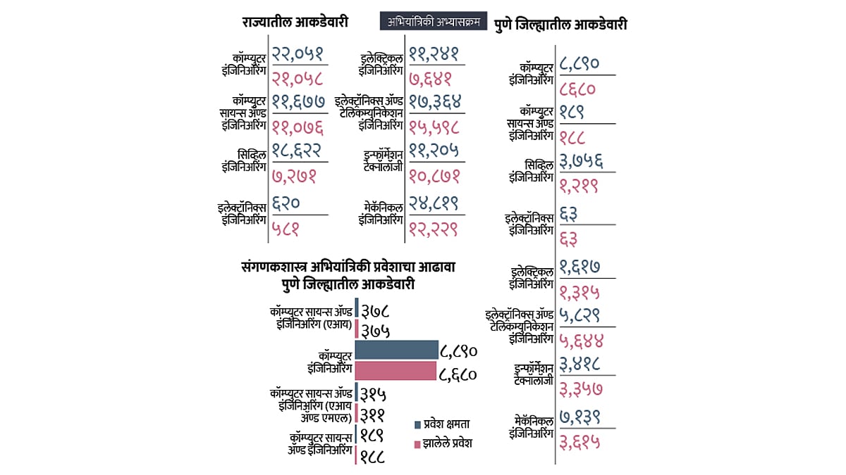 पुणे जिल्ह्यात कॉम्प्युटर इंजिनिअरिंग व संलग्न अभ्यासक्रमाच्या ३१, ५९४ जागांपैकी ७८.३९ टक्के जागांवर, तर केवळ एआय, डेटा सायन्स आणि मनिश लर्निंग, रोबोटिक्स ॲण्ड ऑटोमेशन अभ्यासक्रमाच्या दोन हजार ८३२ जागांपैकी ९५.९४ टक्के जागांवर (दोन हजार ७१७) विद्यार्थ्यांनी प्रवेश घेतला आहे.